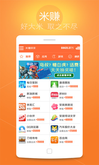 米赚 分类:安卓赚钱 大小:3.30 MB 开发者:北京米拓世纪科技有限公司下载次数:3256最新版本:2.80热度: 作者: 发布: 2020-03-14 10:05:43 支持: Android 2.3以上 Tags: 安卓下载 APP截图 应用介绍 米赚由北京米拓世纪科技有限公司研发并运营,在2011年9月正式发布,是国内第一个专注于移动威客的手机应用,拥有3000万用户,是国内外知名的手机赚钱应用。 安装后完成新手任务即可兑换1Q币!也可兑换话费、提现到支付宝和微信等等! 最新应用 乐米资讯 淘金赚 猫猫赚 每天赚点 灵猴 小龙赚钱 蘑菇乐园 钱大师安卓版 泡泡赚 米赚